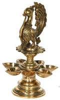 The 11" Seven Wick Peacock handcrafted brass lamp in the decorative lighting category, designed for home temples and ceremonial spaces, featuring a peacock motif that celebrates Indian artisanal traditions in brass.