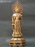 Cast in brass and finished by hand, the sculpture carries a warm, antique glow. Subtle patination accents the folds of the robe and the calm facial expression, while meticulous handwork defines the stance and drapery. Exotic India Art presents this handcrafted work as part of its collection of authentic Indian art.
