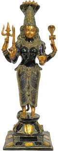 The 25" Goddess Mariamman Brass Idol | Handmade | Made in India is a brass statue that functions as a spiritual idol and decorative figure. Handcrafted in India by skilled artisans, this piece bears a warm antique finish that enhances the detailed relief work and graceful silhouette. The figure reflects Mariamman's iconography through an ornate crown, jewelry, and a poised stance designed to invite contemplation.
