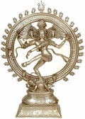 The 42" Large Lord Shiva as Nataraja Dancing on Apasmara is a brass sculpture that presents Lord Shiva in the iconic Nataraja pose. This handcrafted figure is cast in brass using traditional methods and finished by skilled artisans in India. The surface receives a subtle patina to reveal fine contours, while the overall form emphasizes movement and balance inherent in the dance.