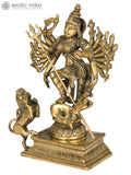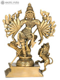 Cast in brass using the traditional lost wax method, this piece is finished by hand to reveal fine detailing in the headdress, jewelry, garments, and weapons. A warm patina and subtle textural variations emphasize the sculptural quality, while the overall silhouette remains clear and elegant. The craftsmanship reflects the artisanal character associated with Exotic India Art.