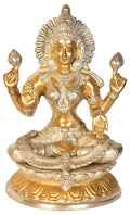 9" Goddess Lakshmi Statue in Blessing Gesture in Brass in the category of spiritual idols, crafted with traditional handwork and a warm metallic sheen. The figure shows Lakshmi in a blessing gesture, a common artistic motif in Indian sculpture that evokes auspicious grace.