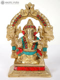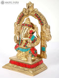 7" Chaturbhuja Ganesha Idol with Kirtimukha Arch | Brass Statue with Inlay Work