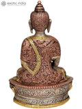 The 7" Buddha In The Dhyana Mudra In Brass | Handmade | Made In India is a brass statue that captures the contemplative dignity of the Buddha in the Dhyana Mudra. Cast in solid brass and finished with a warm antique patina, this handcrafted figure showcases refined detailing in the robes and a serene countenance, highlighting the tactile craftsmanship from tip to base. In traditional Buddhist art, the Dhyana Mudra conveys meditation and inner balance, with the hands resting in the lap and the thumbs lightly touching to form a circle of focus. The piece is finished to reveal the natural warmth of brass, inviting a gentle glow in candlelight or daylight. Ideal for a home temple, meditation space, or as a decor accent on a shelf or altar, it also makes a thoughtful gift for collectors and practitioners of Indian art. Exotic India Art presents this statue as part of its heritage collection of authentic Indian art and handcrafted sculptures, crafted by artisans in India.