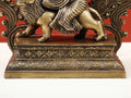 Cast in solid brass and finished with a subtle antique patina, the sculpture reveals precise detailing in the robes, weapons, and the lion's mane. Handcrafted by skilled artisans, the piece bears the marks of traditional metalworking and careful hand polishing.