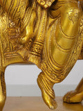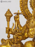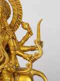 The 17'' Brass Eight-Handed Goddess Durga Idol Seated on Lion is a brass statue and handcrafted sculpture that depicts the goddess Durga seated on a lion, eight arms extended in symbolic gesture.
