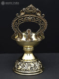 The 5" Superfine Lord Ganesha Diya (Lamp) in Brass with Kirtimukha Arch is a brass diya and decorative sculpture that serves as both a devotional lamp and an artistic centerpiece. Cast in solid brass and finished with a warm antique patina, it showcases refined detailing on the Lord Ganesha figure, the lotus plinth, and the arch crowned by the Kirtimukha motif. Handcrafted by skilled artisans, the work preserves traditional motifs in a contemporary display form. In Indian art, Ganesha is a symbol of beginnings and auspicious energy, and the arch adds a sense of ceremonial grandeur without asserting claims. This lamp invites careful placement in a home temple or meditation corner and can function as a refined decor accent during gatherings. It also makes a thoughtful gift for auspicious occasions or a distinguished addition to a collector's shelf. From Exotic India Art, a heritage brand known for authentic Indian art and handcrafted collectibles.