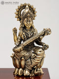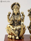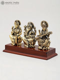 The 7" Superfine Idol of Lakshmi Ganesha and Saraswati Seated on Wood Base | Brass Sculpture is a brass statue presenting Lakshmi, Ganesha, and Saraswati in a compact seated composition.