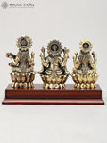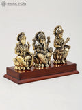 7" Superfine Idol of Lakshmi Ganesha and Saraswati Seated on Wood Base | Brass Sculpture