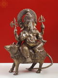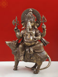 23" Ganesha Seated on His Rat Wearing a Leafy Crown In Brass