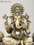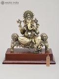 5" Small Superfine Lord Ganesha Seated on Ornate Throne with Wood Base | Brass Idol