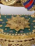 29" Pair of Radha-Krishna on Kirtimukha Swing with Bells | Brass with Inlay Work is a handcrafted brass sculpture in the decorative figure category. From Exotic India Art, a heritage brand known for authentic Indian art and handcrafted collectibles, it is meticulously formed by skilled artisans. The pair is shown seated on a curved swing beneath a Kirtimukha motif, with small bells detailing the frame and the brass surface enhanced by inlay work that highlights jewelry and garments. In traditional Indian iconography, Radha and Krishna symbolize a harmonious bond, a theme captured here through balanced poses and serene expressions. The Kirtimukha element adds an auspicious focal point that elevates the composition for display. This piece suits a home temple or meditation corner, a refined decor accent on a shelf or altar, or a thoughtful gift for collectors of brass sculpture. Each piece is handcrafted and unique, reflecting artisanal care.