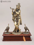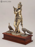 12" Superfine Idol of Lord Krishna Playing Flute in Tribhangi Gesture with Peacock and Wood Base | Brass Statue is a brass statue of Lord Krishna in the classic tribhanga pose as he plays the flute, valued for rhythmic grace.