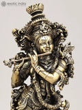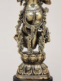 9" Superfine Radha and Krishna - Symbol of Eternal Love and Harmony with Wood Base | Brass Sculpture is a finely crafted brass statue featuring the divine couple perched over a warm wood base. The piece showcases meticulous hand engraving and a smooth, polished brass finish that highlights detailed jewelry, robes, and facial expressions. Artisans have shaped Radha and Krishna in a gentle, seated pose conveying balance and devotion. The craftsmanship reflects traditional Indian metalworking techniques and a reverence for fine detailing. In Indian art this duo symbolizes love and harmony, inviting contemplation of balance between earthly affection and spiritual devotion. The wood base provides natural contrast and stability, making it suitable for a home temple, meditation corner, or a decor accent in living spaces. From Exotic India Art, a heritage brand known for authentic Indian art, this sculpture is well suited for gifting to collectors of Indian art or for display in a personal altar or shelf where its handcrafted detailing and artisanal quality can be appreciated for years to come.