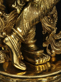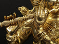 The 25" Superbly Adorned Lord Krishna Standing on Lotus Pedestal Playing Flute In Brass | Handmade | Made In India is a brass statue that portrays the youthful deity in a poised, musical stance. The piece serves as a refined representation of Krishna in traditional iconography, balanced on a lotus base that signifies purity and growth. Crafted in solid brass, the figure carries a warm, golden hue with a refined patina that develops with age. Finely chased jewelry, a delicate crown, and the flute are rendered with careful attention to proportion and texture. The lotus pedestal roots the sculpture in traditional symbolism and adds a serene elevation to the composition. This piece honors traditional Indian sculpture, where Krishna is celebrated as a flute musician whose lilting melody is said to enchant the senses and inspire devotion. The artistic interpretation here emphasizes balance, grace, and movement captured in a single pose. Ideal placements include a home temple for daily homage, a meditation space for focus, or as a decor accent on a shelf or console. It also makes a thoughtful gift for art lovers and collectors. This sculpture highlights handcrafting and artisanal quality that Exotic India Art is known for, reflecting skilled workmanship in every curve and contour.