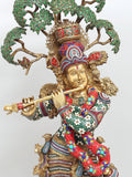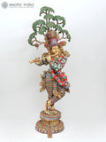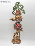 58" Large Tribhanga Murari Krishna with The Kadamba Tree Behind Him | Brass Statue with Inlay Work