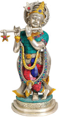 The [PRODUCT TITLE] is a brass statue in the devotional sculpture category, depicting Murli Krishna in a composed flute playing pose. Standing twelve inches tall, this piece features inlay brass accents and is handcrafted in India.