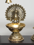 Crafted in brass with a warm patina, the figures are hand finished to highlight superfine fluting along the robes and hair. The wood frame offers a natural finish that complements the brass, while the peacock lamp motifs act as ornamental supports.