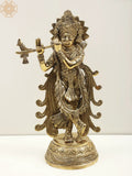 The 13" Brass Lord Krishna Playing Flute is a brass statue in the devotional sculpture category. Crafted from solid brass, the figure is finished with a warm antique patina that accentuates the graceful contours of Krishna as he holds a flute and wears a crown adorned with a peacock feather.