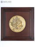 Cast in solid brass, the plate is hand polished to a warm radiance and finished with a subtle lacquer that protects the surface while letting the metal's natural luster breathe. The wood frame is smoothly joined, with clean edges and a natural grain. Produced by artisans associated with Exotic India Art, a heritage brand known for authentic Indian art.