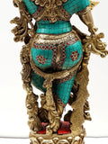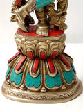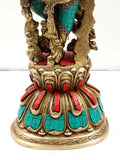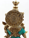 Cast in brass and finished by hand, the sculpture carries a refined patina that highlights the instrument, attire, and crown. From Exotic India Art, it embodies the tradition of handcrafted Indian metalwork, with artisans applying traditional hammering, polishing, and inlay techniques to shape the figure and enhance the detailing with meticulous care.