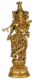 24" Krishna Playing on Flute In Brass | Handmade | Made In India is a brass statue that sits within the devotional sculpture category. Crafted by skilled artisans in India, this piece captures Krishna in a moment of melodic quiet as he plays the flute. The tall silhouette offers a statuesque presence for display in a home temple or meditation corner. Material and finish: solid brass with an antique patina achieved through traditional polishing and gentle aging. Handcrafted detailing reveals the flowing robes, curling hair, and the slender flute. The surface carries a warm luster and subtle variations that reflect the artisan's patience and care. Display and significance: Krishna is a recurring figure in Indian art known for music and playful energy, and this representation emphasizes artistry and cultural storytelling without religious claims. Ideal for home temple, meditation space, decor accent, or collector display. It also makes a thoughtful gift for lovers of Indian sculpture. This piece is part of Exotic India Art's heritage collection of authentic Indian art.