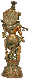 24" Murlidhar Krishna In Brass | Handmade | Made In India is a brass statue that depicts Murlidhar Krishna, the flute playing form of Lord Krishna. Cast in solid brass and finished with a warm antique patina, the sculpture showcases a hand polished surface and carefully defined features, with attention to the folds of the garments and the slender flute. Exotic India Art offers this sculpture, reflecting its heritage of authentic Indian art. In Indian art, Krishna with a flute is celebrated for its lyrical presence and graceful balance, inviting quiet reflection in a room. The figure conveys cultural resonance through its traditional iconography without making religious claims. Place this statue in a home temple, meditation space, shelf vignette, or as a thoughtful gift for art lovers and collectors. Handcrafted by skilled artisans, each piece bears unique marks of the maker, ensuring artisanal quality and individuality rather than mass produced uniformity.