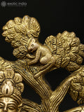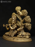 The 5" Small Lord Krishna Seated Under The Tree with Cow | Brass Statue is a brass devotional sculpture that belongs to Exotic India Art's collection. This compact figure depicts Lord Krishna seated calmly beneath a stylized tree, with a cow nearby, rendered in a refined, balanced stance that captures a moment of pastoral serenity.