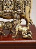 The 7" Superfine Kamadhenu Cow and Calf with Baby Krishna | Brass Statue on Wood Base is a brass sculpture in the animal and mythic figurine category. Cast in brass and mounted on a carved wood base, it presents a refined surface with a warm patina that highlights every fold and contour. The finish preserves delicate details and the graceful line work achieved by traditional hand finishing.