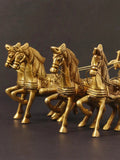 Crafted in brass using a traditional lost wax technique, the sculpture features a warm aged patina and finely etched details on the figures, reins, and chariot elements. Each piece bears slight variations that attest to its handcrafted origin and the artisanal attention given to every line and curve.