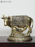 Cast in brass and finished with a subtle satin patina, the sculpture is hand finished by skilled artisans and forms part of Exotic India Art’s collection of authentic Indian art. The superfine fluting and delicate detailing highlight Krishna's flute and the bond with the cow and calf, while the wood frame provides a restrained, natural border that suits classic and contemporary interiors.