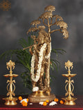Superfine Superbly Embellished Krishna Fluting Under a Magnificent Tree (Large Size) is a brass statue in the devotional sculpture category. Cast in brass and finished with a warm antique patina, this piece presents Krishna playing his flute beneath a grand tree, rendered in careful detail.