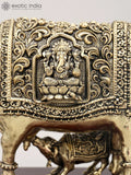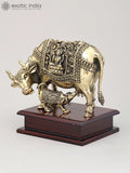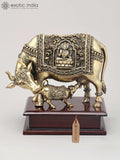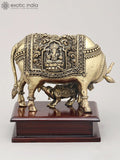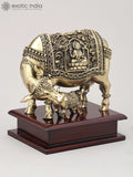 6" Superfine Goddess Kamdhenu Cow and Calf with Goddess Lakshmi Carving on Wood Base | Brass Statue