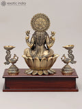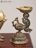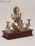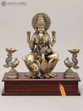9" Superfine Four Armed Goddess Lakshmi with Peacock Lamp and Wood Base | Brass Idol Dimensions