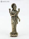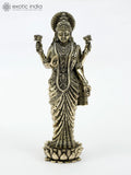 Superfine Four-Armed Goddess Lakshmi Brass Statue Standing on Lotus | Different Sizes Idol is a brass spiritual idol in the decorative sculpture category. This statue depicts Lakshmi with four arms and a poised stance on a lotus pedestal, reflecting a traditional iconographic form that invites quiet contemplation and respect.