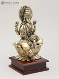 Superfine Goddess Lakshmi Seated on Lotus Flower with Wood Base | Brass Idol | Made in India