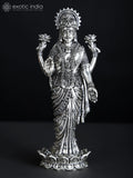 Superfine Standing Goddess Lakshmi Idol in Blessing Gesture | Silver Plated Brass Statue is a decorative statue crafted in brass and finished with silver plating, depicting the goddess Lakshmi in a blessing gesture.