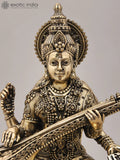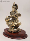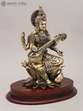 11" Superfine Chaturbhuja Goddess Saraswati Seated on Lotus with Sitar and Wood Base | Brass Statue