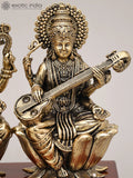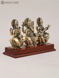 9" Superfine Goddess Lakshmi Ganesha and Saraswati Seated on Wood Base | Brass Sculpture