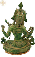 Cast in brass and finished with a warm antique patina, the sculpture reveals careful hand detailing in the posture and in the items held across the four hands. Nepalese artisans perform patient hand finishing to preserve the metal’s texture.
