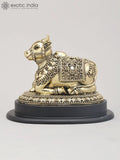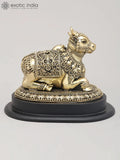 The 6" Superfine Seated Nandi Idol - The Vahana of Shiva with Intricate Carving and Wood Base | Brass Statue is a brass statue depicting Nandi, the vahana of Shiva, shown seated as a poised guardian figure for intimate spaces.