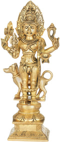 Cast in brass and finished by hand, the figure showcases meticulous detailing in the headdress, facial features, and sacred ornamentation. The surface receives a refined patina that adds depth while preserving the natural luster of the metal. This sculpture aligns with Exotic India Art's heritage of authentic Indian art.