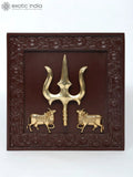 19" Kamadhenu Cows with Trishul/Trident | Wood Framed Brass Sculpture | Wall Hanging