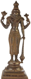 The 20" Lord Vishnu Brass Sculpture Indian Handcrafted Idol is a brass statue in the spiritual idol category, created by skilled Indian artisans. It presents Vishnu in a traditional four armed form, a common portrayal in Indian sculpture and devotional art. Cast in brass using a traditional lost wax method, this sculpture is hand finished to reveal refined detailing in the crown, jewelry, and drapery. The surface carries a warm patina that enhances the depth of the figure and the balance of its pose, with meticulous attention to proportion and form. In traditional iconography Vishnu is the preserver deity within the Hindu trinity, and this form typically depicts four arms holding symbolic objects such as a conch, discus, mace, and lotus. The composition conveys a sense of steadiness and cosmic order that is appreciated in Indian art and sculpture. The piece is well suited for a home temple, a meditation space, or as a decorative accent on a shelf or altar. It also serves collectors of Indian art who value handcrafted sculpture with authentic artisanal character. Exotic India Art presents this sculpture as part of its collection of authentic Indian art and handcrafted collectibles. Each piece reflects careful handcrafting and unique artisanal details.