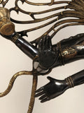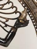 Forged in solid brass with a black patina and gold accents, the finish highlights the sculpted lines and the radiant ring of fire around the deity.