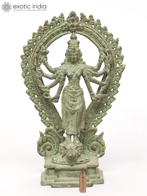 10" Eight Armed Standing Goddess Durga with Ornate Prabhavali | Brass Statue