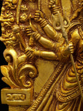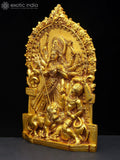 The 10" Mahishasuramardini (Goddess Durga) | Wall Hanging Brass Statue is a brass sculpture designed for wall display and devotional decor. This piece depicts Durga in the Mahishasuramardini form, emblematic of her alliance with divine power and protective energy, a familiar motif in Indian art. Crafted in solid brass, the statue carries a warm brushed finish with an antique patina that deepens the relief work on her armor and weapons. Skilled artisans employ traditional techniques to render fine jewelry, fluttering drapery, and a regal stance, yielding a tactile sense of depth and texture. In traditional iconography this Durga form is recognized in Indian art as a portrayal of strength, balance, and protective energy. The composition invites contemplative appreciation and serves as a reminder of courage and disciplined resolve. Ideal placements include a home temple or altar, a meditation space, or a living room wall where its presence acts as a refined focal point. It also makes a meaningful gift for auspicious occasions or a distinguished addition to a collector display. From Exotic India Art, a heritage brand celebrated for authentic Indian art and handcrafted collectibles.