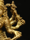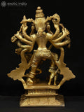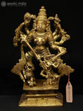 Cast in brass and finished by skilled hands, the figure showcases careful surface textures and clean lines. The multiple arms hold slender weapons, and the composition captures the decisive moment when Durga overcomes the demon Mahishasura. Subtle depth is achieved through measured chasing and polishing, resulting in a warm tactile glow. From Exotic India Art, this piece reflects the enduring tradition of handcrafted metal sculpture.