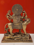 "9" Eight-Armed Durga on Her Mount | Handmade Brass Sculpture is a handcrafted brass statue from Exotic India Art that presents the goddess Durga on her mount in an assertive, eight-armed profile. Cast in brass using traditional methods, it is finished with a warm hand polished surface and subtle patina that deepens the figure's contours. Each element, from the crown to the fingers, reflects careful artisanal craft and balanced proportion, hallmarks of authentic Indian sculpture. The eight arms emphasize the iconic multiplicity of Durga while maintaining a calm, dignified presence on display. This sculpture serves as a decorative figure that carries iconographic symbolism tied to Indian art, without asserting religious claims.