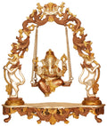 18" Lord Ganesha Statue on a Swing with Kirtimukha atop in Brass | Handmade | Made in India is a brass statue in the decorative sculpture category that presents Lord Ganesha seated on a suspended swing, crowned by a Kirtimukha motif atop the arch above.